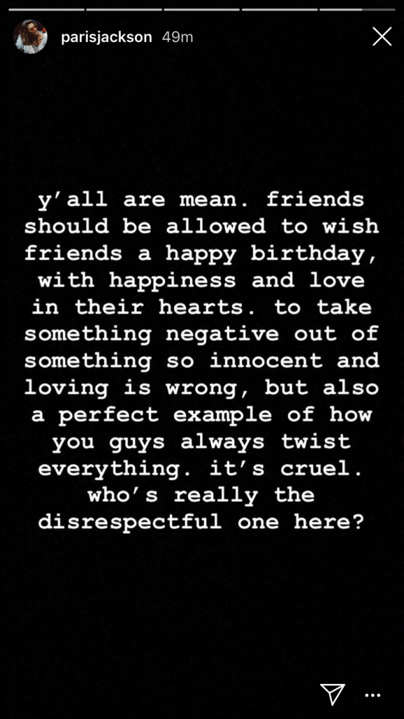 “y’all are mean,” Jackson wrote. “Friends should be allowed to wish friends a happy birthday, with happiness and love in their hearts. to take something negative out of something so innocent and loving is wrong, but also a perfect example of how you guys always twist everything. it’s cruel. who’s really the disrespectful one here?