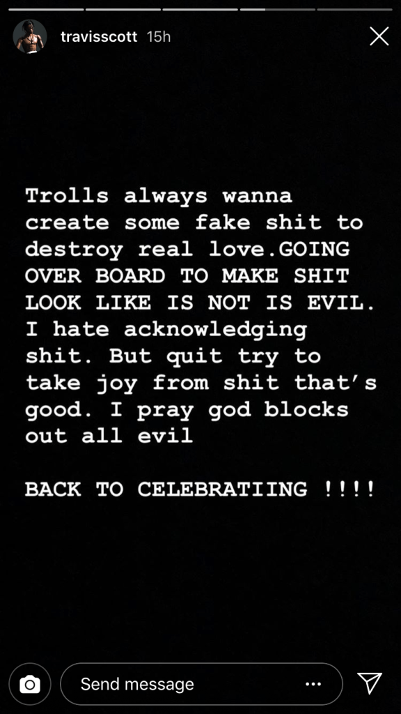 But how much of the picture can we believe? Well, according to Scott, none of it. After a fan asked him about the photo on Instagram, Scott commented back, denying that he cheated on Jenner and claiming that the picture was photoshopped. “Trolls working hard today,” he wrote. “I don’t be on a balcony wit no thots. That shit lame. Try again u trollsssss. Me and my wifey sturdy. Back to celebrateing !!!” He added, “Only got love for my wife. No time to be wasting. Try again.”
