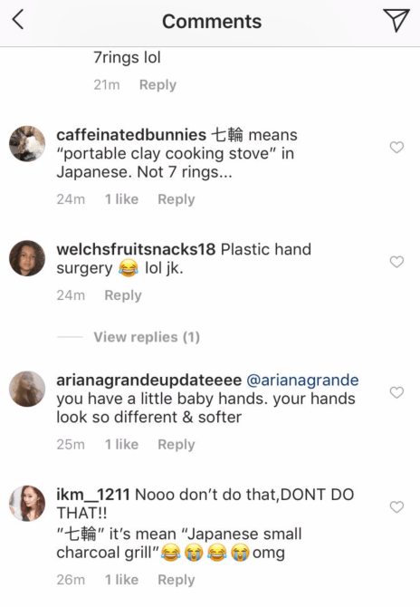 The user included the photo of Grande’s palm, along with a screenshot of some comments from Instagram users on Grande’s OG Instagram picture: