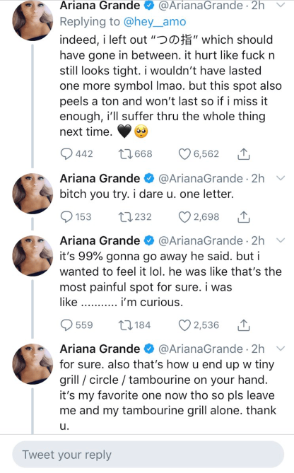 “It’s 99% gonna go away he said,” Grande continued in another tweet. “but i wanted to feel it lol. he was like that’s the most painful spot for sure. i was like ……….. i’m curious.” A user took screenshots of Grande’s tweets before they were later deleted: