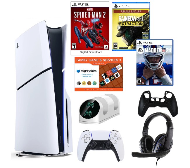 Includes PS5 Slim disc console with DualSense wireless controller, power cord, HDMI cable, USB-C-to-USB-A cable, and stand; Spider-Man 2 game download voucher, Madden NFL 24 game, Rainbow Six Extraction game, dual charging dock, silicone sleeve, wired headset, and voucher.