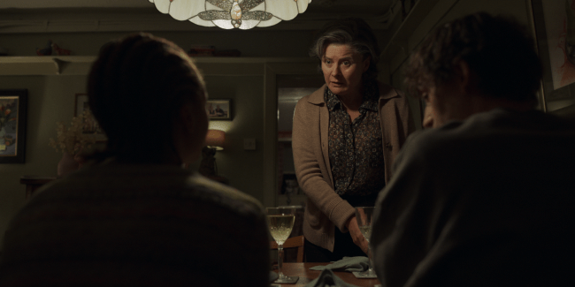 Pia discovers that Davis’ mother Janet (played by Monica Dolan) was involved in Iain Adair’s murders by watching a VHS that captured the whole thing. She then sees the red mask at dinner, confirming that it was indeed Janet in the video and she makes a run for it.
