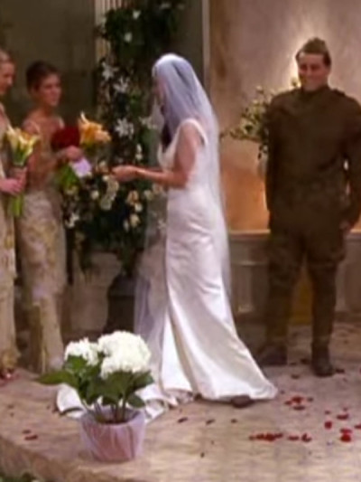 Monica’s wedding dress on Friends could have been a testament to the times (um, ’90s fashion is kind of hard to forget) and everyone would have known the decade of its reign. Instead, the character wed Chandler in a sleeveless silk gown with a timeless mermaid skirt.