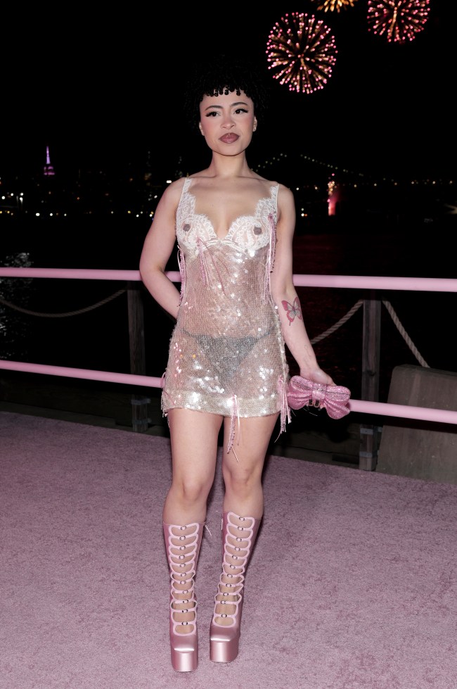 Ice Spice turned heads with a super girly yet revealing outfit. She wore a sequin mini dress with nipple cutouts, a rhinestone-studded bow clutch, and the iconic pink Marc Jacobs Kiki Boots. Who says sexy can’t be sweet? And although her brand new dark hair is definitely a shock, all we can think about is how she completely reinvented freeing the nipple.