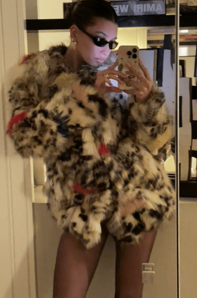 The Rhode founder, who recently gave birth to her first child—a boy named Jack Blues with husband Justin Bieber—kicked off the social media carousel with a snap that showed her posing in a convenience store. For the outing, Hailey rocked an oversized leather jacket, a black T-shirt, polka dot tights, and pointed-toe black pumps. She added on a pair of circular sunnies and filled her arms up with candy. Hailey also wore the look to the Saint Laurent show where she posed with Zoe Kravitz, who left little to the imagination in a nipple-baring silk dress. In a different snap, Hailey wore a plush animal print faux fur coat with tights, and of course, no pants. For an additional PFW outing, she shined in a textured metallic blazer, statement earrings, and nothing else. “32 hrs in the city of ❤️ and 🥐’s,” Hailey captioned the post.