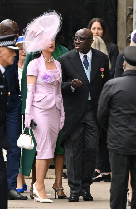She kept it prim and proper when she arrived with Edward Enninful, editor-in-chief of British Vogue. Perry’s lavender ensemble was fitting for the coronation day, since the color purple in the Bible is associated with royalty. That nod to the momentous day came through from top to bottom in Perry’s look, starting with her off-center hat and all the way down to the sheath dress covered by a short sleeve jacket and pinned with a flower. She accented the look with a three-strand pearl choker (complete with a diamond encrusted Sovereign’s Orb—another nod to the coronation), a white hand bag and white heels.