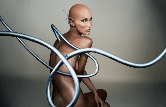 One of the most iconic images from the campaign captures Hadid in her birthday suit, her bare back to the camera. A gleaming silver tentacle extends from her spine, curving gracefully behind her. The pièce de résistance? Marc Jacobs’ coveted Network ear cuff, a futuristic accessory that perfectly complements her AI-inspired ensemble.