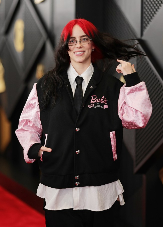 Eilish wore an oversized, vintage hot pink Barbie-themed varsity jacket from Chrome Hearts, paired with baggy black pants and a crisp white Willy Chavarria button-down shirt. The jacket featured silver heart-shaped buttons and the classic “Barbie” embroidered on the left side above three smaller designs. Adding to the snarky corporate secretary vibe, which would be incomplete with a pair of skinny prescription opticals, she finished off the look with a skinny black tie. The chic ensemble was perfected with a simple hairstyle: Eilish’s iconic red and black hair styled to the center part.