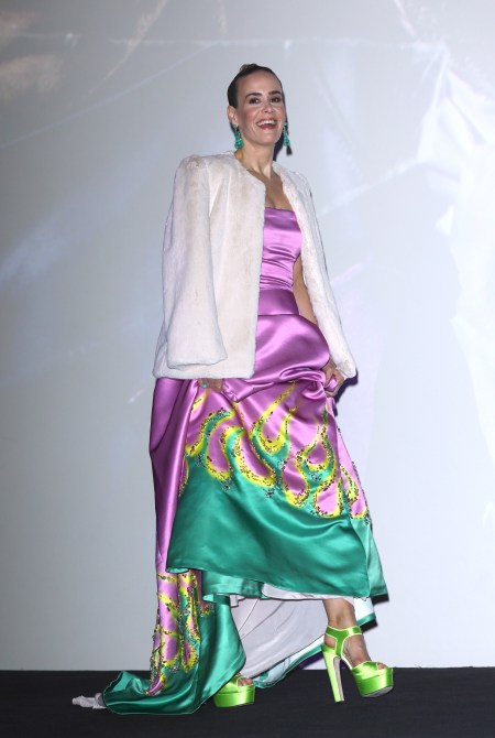But wait—there’s more. Just when we thought Paulson had concocted the wildest movie premiere ensemble of 2019, she lifted up her dress to reveal neon green platform heels. Frankly, we’re not entirely sure Paulson wasn’t abducted by aliens and sent to an outer space fashion convention. The entire look screams Zenon: Girl of the 21st Century meets NASCAR meets The Little Mermaid—a truly bizarre combination, and one that perhaps only Paulson herself could pull off.