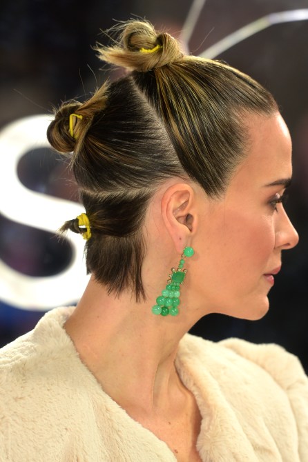 Adding fuel to the sartorial fire, Paulson topped off her shockingly hot Prada gown with a cozy Hiraeth faux fur jacket. (It is winter, after all.) She accentuated the fiery ensemble with beautiful jade green earrings by Irene Neurwirth and an Edie Parker clutch. (TBH, we’re really curious to know what Paulson carries in there.) The actress’ hair was pulled back into three little buns—a perfect way to further her whole avant-garde flame-dress vibe. Plus, the buns are held in place by tiny yellow hair ties that match the yellow of her dress. It’s all in those details, folks.