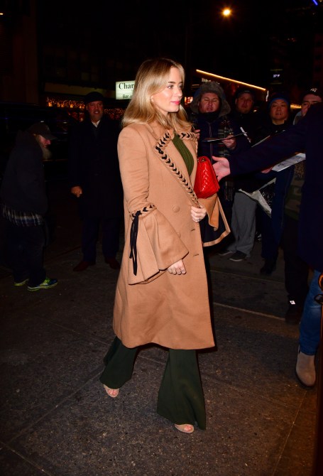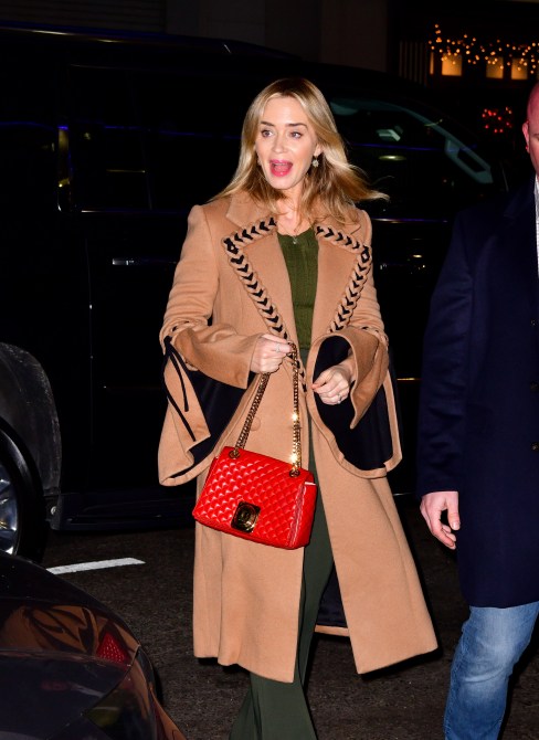 The star of Mary Poppins Returns arrived to New York’s Feinsteins/54 Below stunning us all in a chic camel trench coat with trim that’s braided to perfection. Underneath, Blunt wore head-to-toe olive green, accessorizing the look with a red purse. (Seriously, only Emily Blunt could wear red and green together and not look like a Christmas mishap.) Her blonde hair was effortlessly wavy, and her lips, a classic red. It’s the kind of outfit that says, “Yes, I do look flawless—thanks for noticing.”
