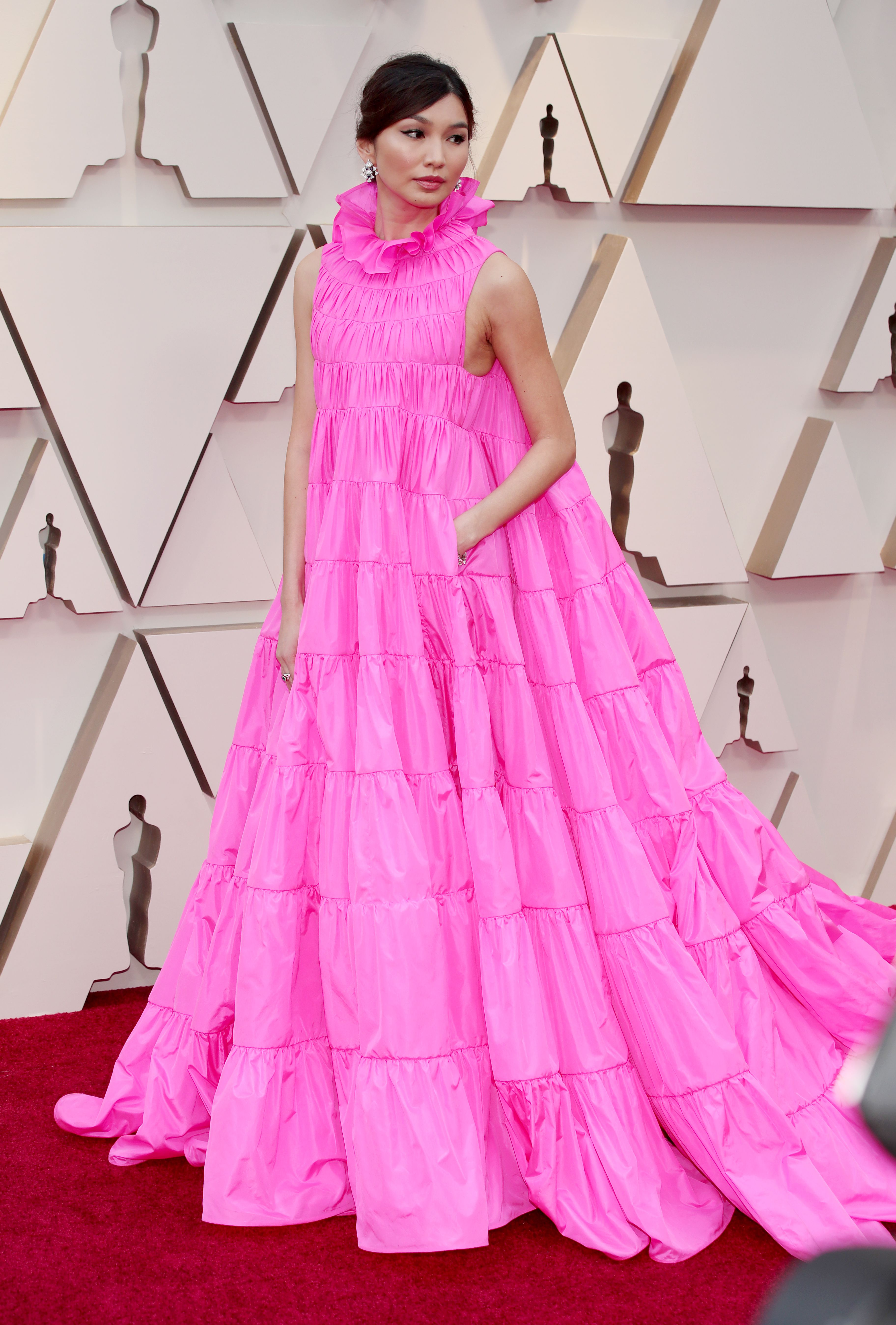 Gemma Chan wore a huge hot pink gown that reminds me of a comforter—in a good way. It also has pockets, y’all.