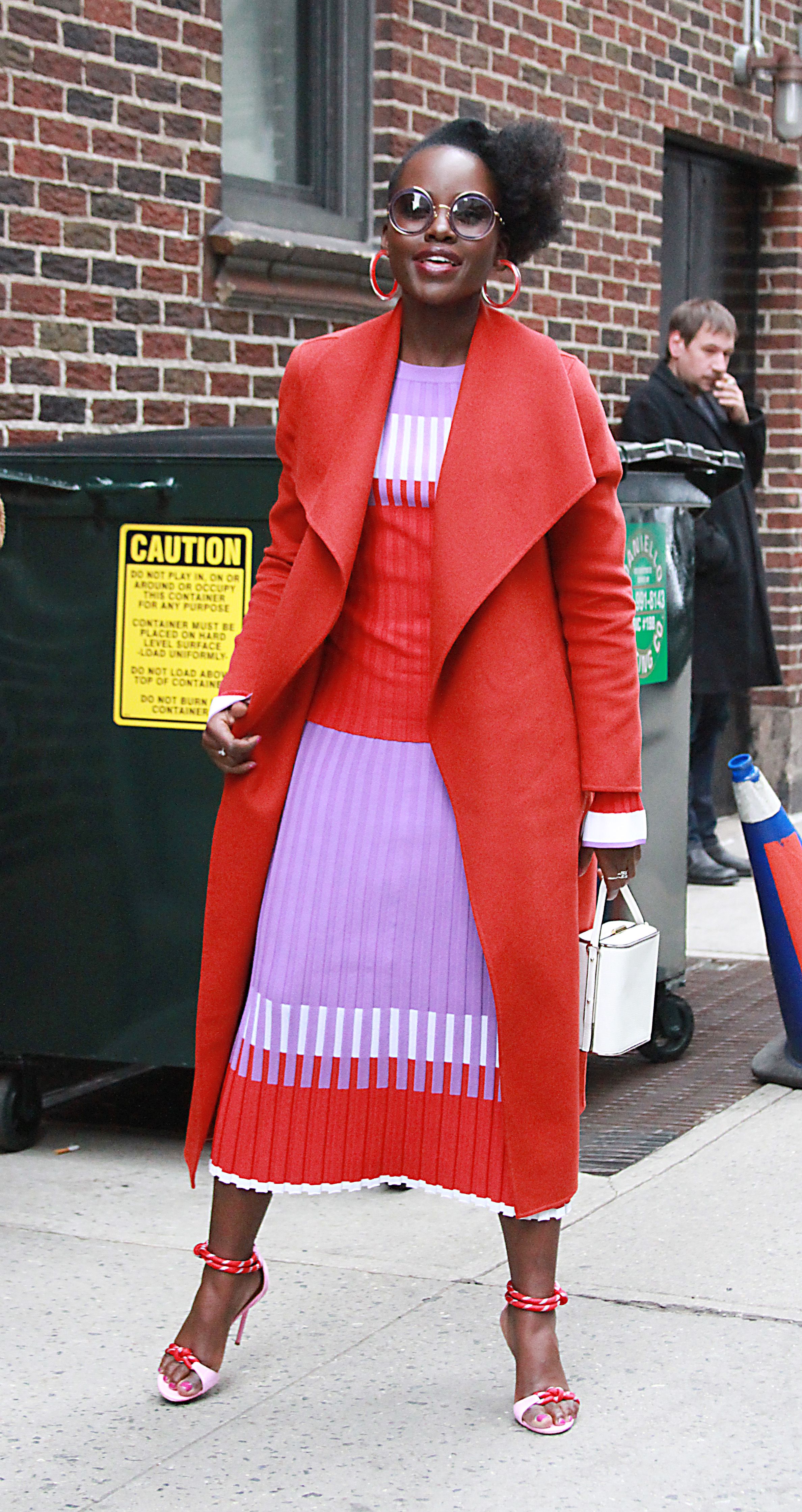 The actress practically embodied a sunny day as she arrived at The Late Show studio wearing a Prabal Gurung ensemble.The outfit featured a red, white and purple midi dress—think ultra-chic grandma vibes—and a flawless red overcoat. Nyong’o managed to emit total spring vibes even while facing the chilly NYC weather. (Spring coats really are a thing, and Lupita Nyong’o just proved it.)