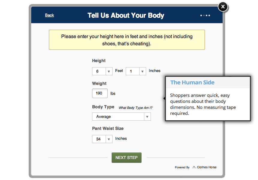 Basically, it’s a tool that will be on over 600 e-commerce sites that allows shoppers to click on a “What size am I?” button. From there, you’ll be brought to a quick (and we really mean quick! It takes about 20 seconds!) pop-out Clothes Horse survey with basic questions about your size. The pop-out will then do it’s job to calculate the perfect size for you in a specific brand, instead of you having to consult a generic size chart.