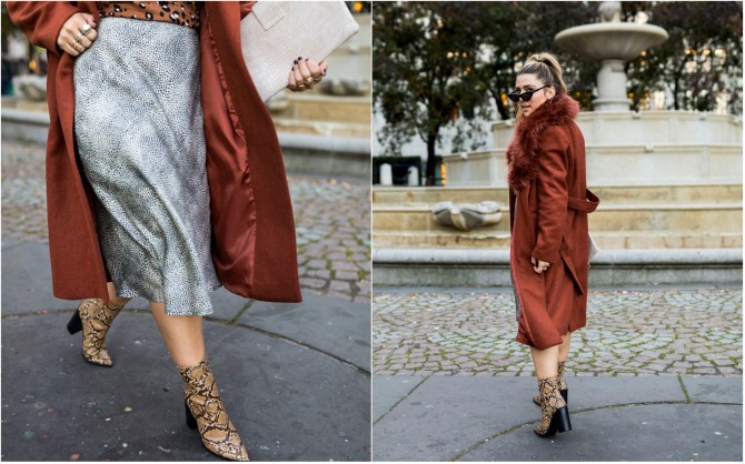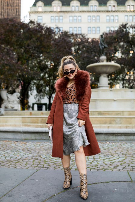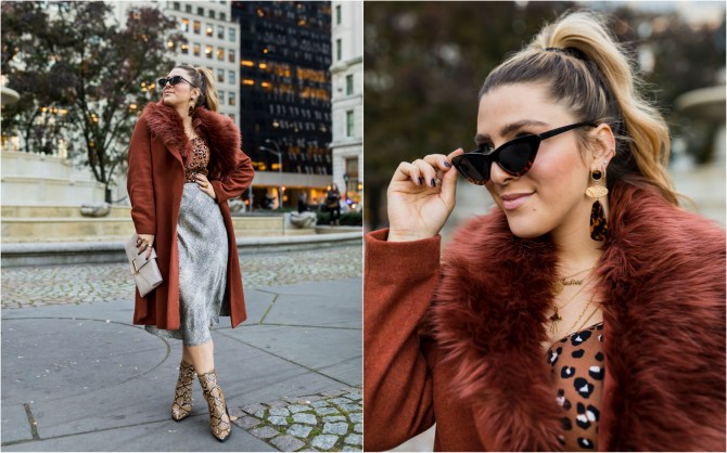Each animal print was a different size—a large leopard print on the top, a micro print on the skirt, a tight snakeskin on the shoes and a subdued crocodile print on the clutch. I added a pop of tortoise print with my earrings and sunglasses and finished off the look with a fuzzy details, like a faux fur collar and rust coat.