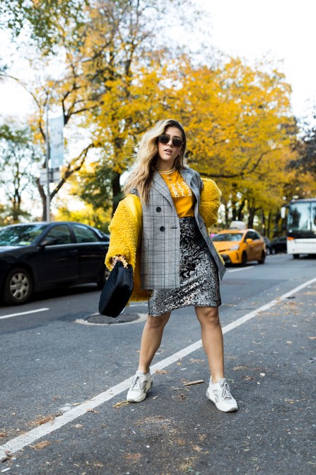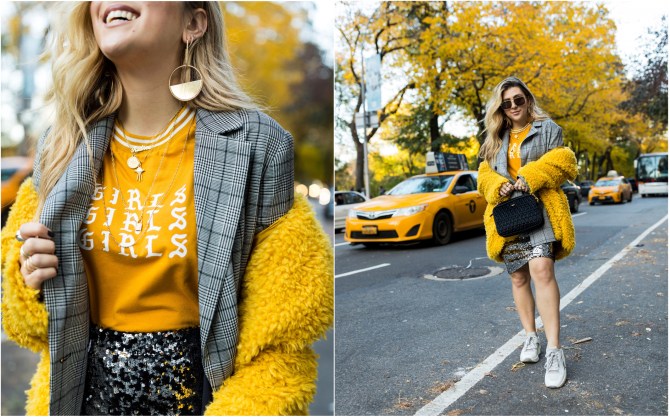 I grabbed my sequin pencil skirt and paired it with a plaid blazer, logo sweatshirt, chunky sneakers and oversized yellow faux fur coat. Then, I layered on some statement earrings, gold stacked necklaces and a velvet bag.