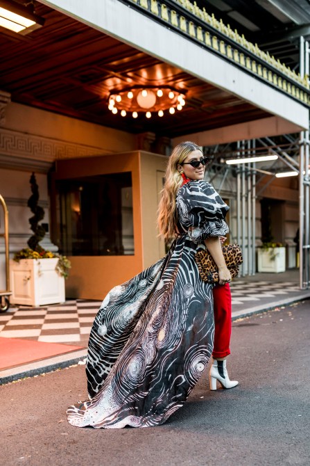 Talk about a statement blouse. The sleeves practically have their own zip code, the exaggerated train is not for the faint of heart, and the “Starry Night” print is a conversation starter in and of itself.