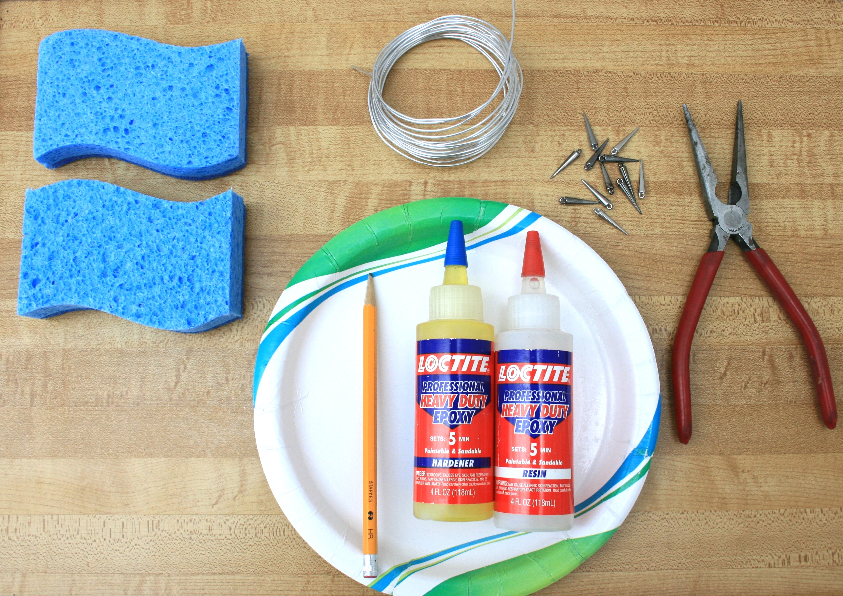 What You’ll Need: 16 gauge aluminum wire, spike beads, two paper plates, two sponges, heavy duty epoxy, a pencil, and needle nose pliers