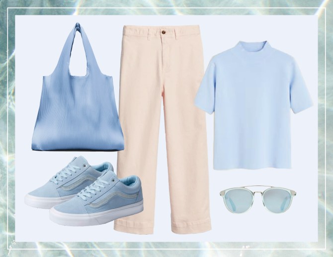 Shop the look: High Rise Wide-Leg Crop Chinos in Light Pink, $59.95 at Gap; Pleated Fabric Shopper in Fresh Blue, $49 at Cos; Ribbed Knit Top in Sky Blue, $59.99 at Mango; Jelly SideStripe Old Skool in Cool Blue, $70 at Vans; Harlan Blue Crystal Blue Mirrored Lens, $159.95 at Toms.