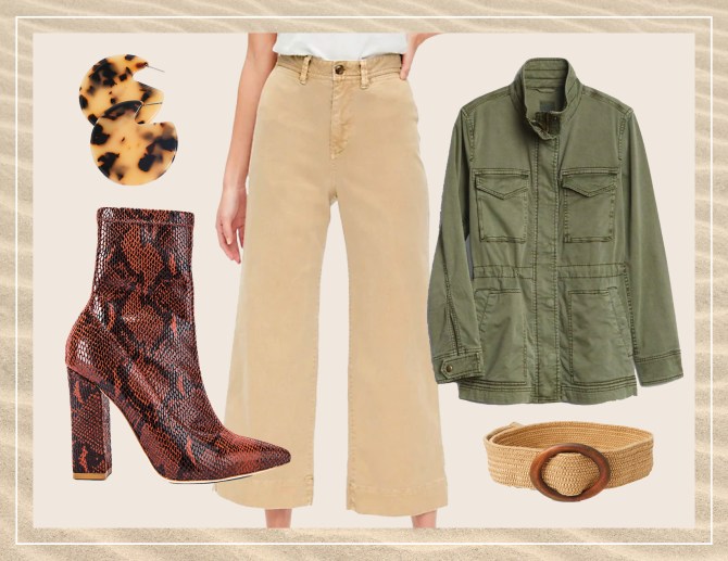 The exotic-meets-utilitarian safari look is easy to nail, when you rely on a couple classic pieces, like high rise wide-leg chinos in khaki and an army green utility jacket, to do the heavy lifting. Cinch a 70s-style belt over the jacket, and add tortoise-shell earrings and snakeskin ankle boots—the smart crop of the pant assures they’ll get seen!