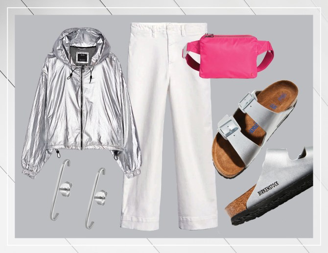 Shop the look: High Rise Wide-Leg Crop Chinos in White, $59.95 at Gap; Silver Nylon Jacket, $49.90 at Bershka; Birkenstock Arizona Silver Sandals, $110 at Urban Outfitters; Webster Fanny Pack, $75 at State; Classic Suspender Earrings, $99 at Maison Miru.