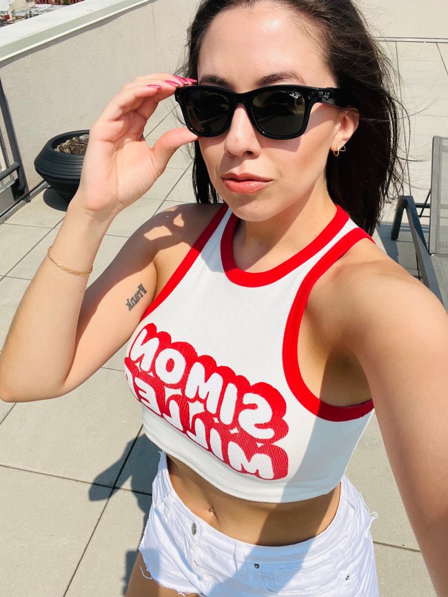 When I’m not in the mood for an all white look, I love tossing this red trimmed Simon Miller tank top into the mix. My favorite thing about this tank is that it’s definitely going to make it into my fall wardrobe. I can just see myself styling it with low-rise cargos now.