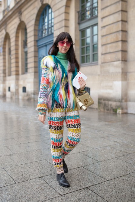 A guest is seen attending Alexis Mabille wearing a colorful patterned outfit, colorful faux-fur scarf and gold bag.