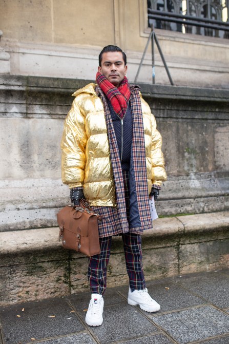 This guest is wearing a gold metallic down coat, plaid scarves and pants and white Fila sneakers outside the Célia Kritharioti show.