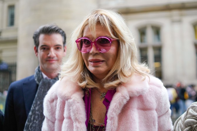 French singer Amanda Lear attends Atelier Jean-Paul Gaultier wearing a pink fur coat and pink sunglasses.