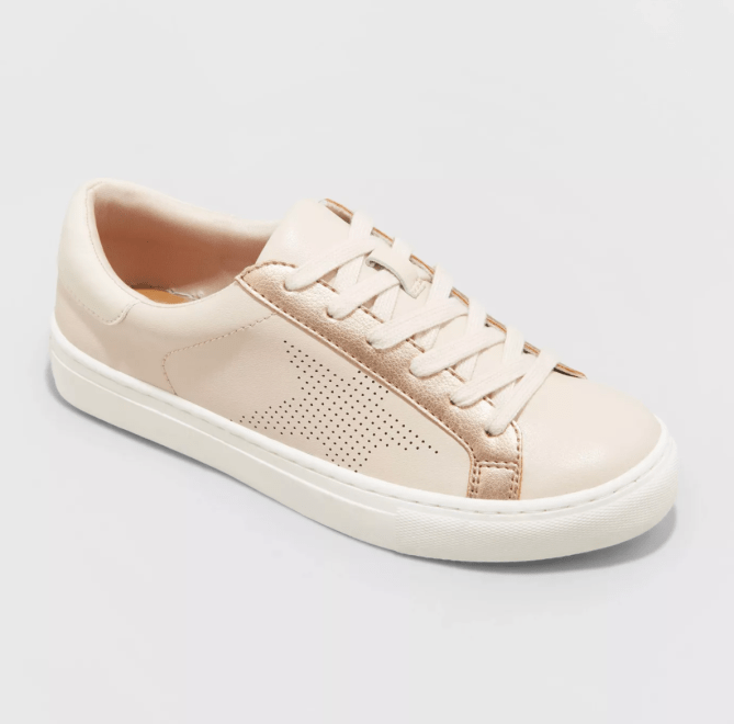 If you want a go-with-everything shoe that’s not just your typical white, opt for these pretty tan Golden Goose lookalikes that feature a fun rose gold trim for an unexpected touch.