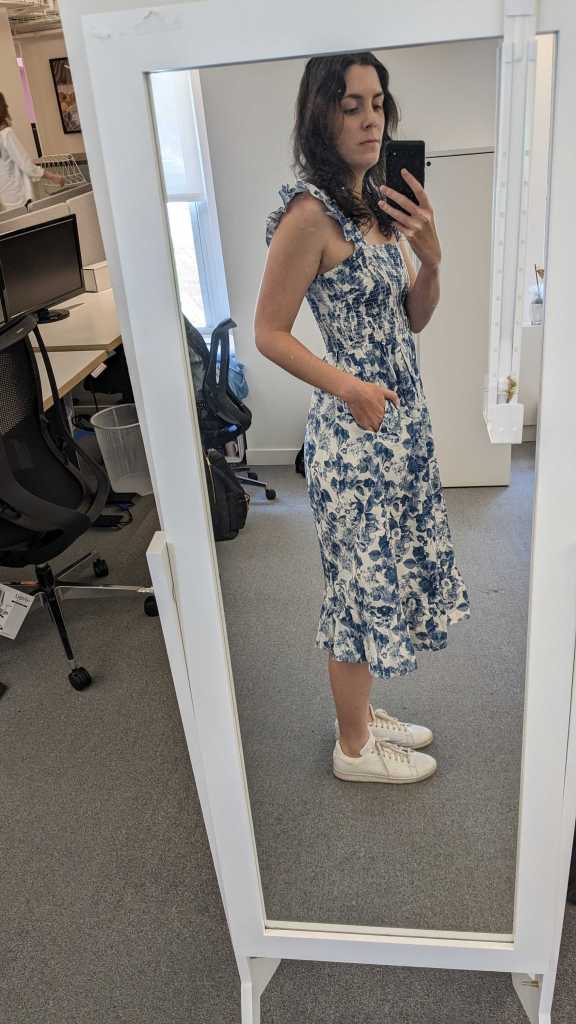 “This pretty, summery sundress isn’t something I would usually wear—I definitely lean more towards masculine tailoring, t-shirt-and-jeans vibes—but I have to say I’m a full “nap dress” convert. It has a few things going for it. One: it’s fully lined so there’s no risk of underwear peaking through, two: IT HAS POCKETS. Third: Within 15 minutes of me wearing it on the daily commute, I got two compliments from strangers. 10/10 would wear again.”