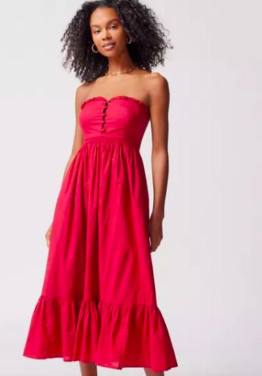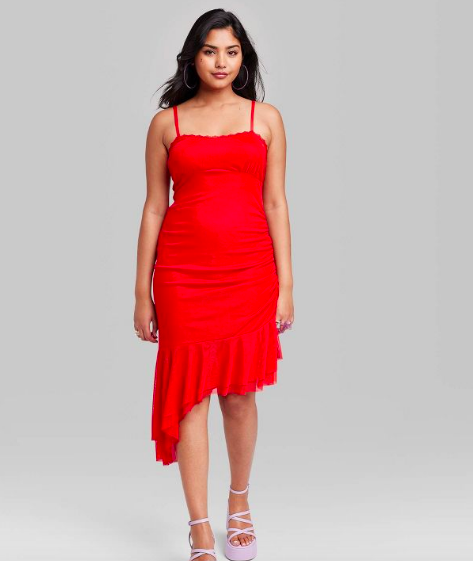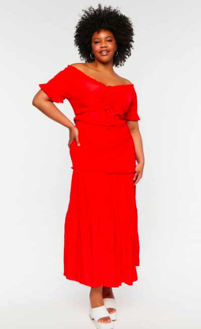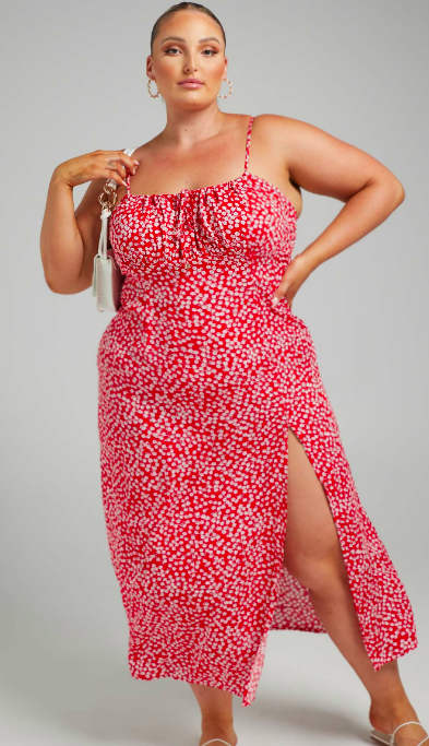 Showpo has so many red summer dresses available, like this midi dress with subtle floral detailing available in sizes 0 through 14. If you get hot easily (raises hand!) this is the style to reach for since it’s made with 100% cotton and has a slight stretch to it. It allows for airflow and won’t stick to you as you twirl underneath backyard twinkle lights.