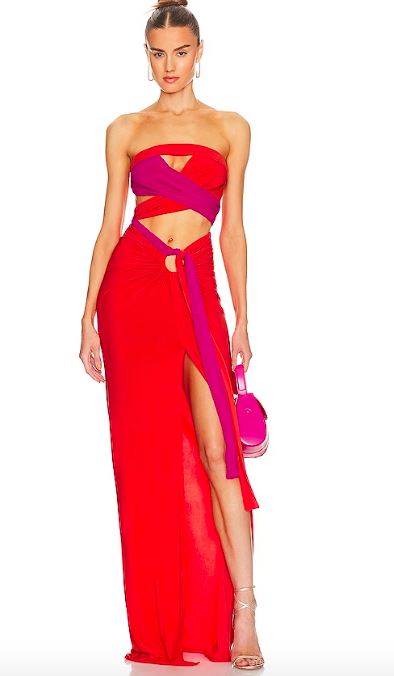 Go bold this summer with this statement-making red maxi summer dress. It wraps around for a customized fit and the pop of purple adds dimension.