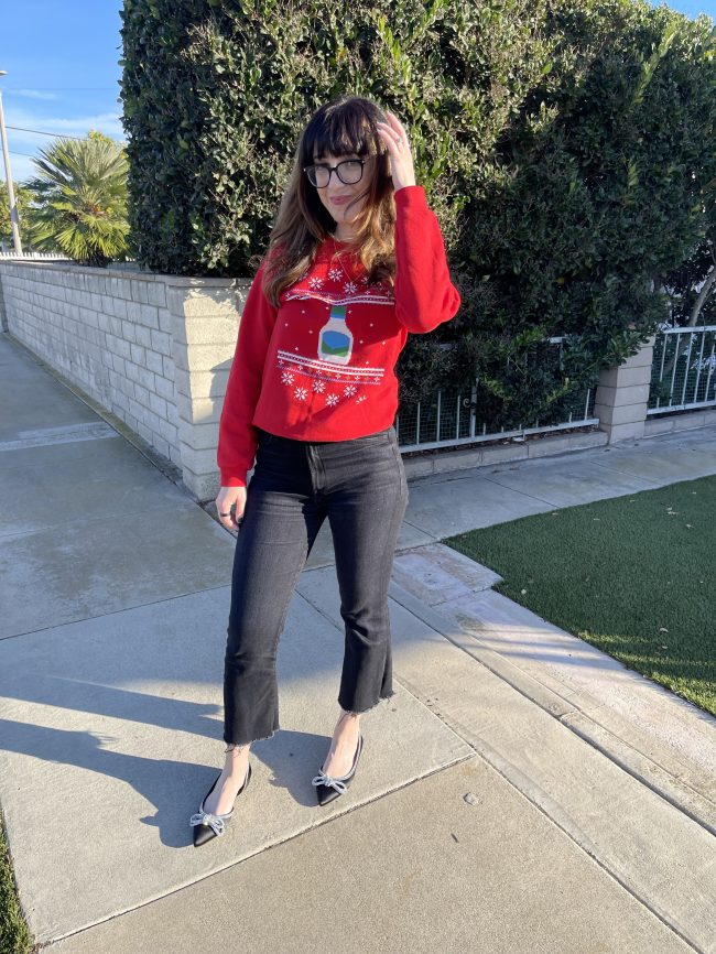 And they are. So far, I’ve been wearing them to the office and lunch, but I plan on wearing them for Russian New Year’s, an event my family takes super seriously and dresses for the occasion. Here’s my outfit on the day I went out to lunch. I kept it casual with some MOTHER jeans and an old Hidden Valley Ranch ugly Christmas sweater (I love camp), but the heels gave my ensemble a pop of glitter and fun. Best of all? Since they’re flats and well-made, they were so comfortable to wear around town.