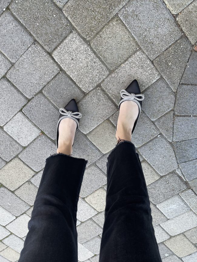 Crafted from a satin-like material, these immediately feel more elevated than your everyday cloth or leather flats. The memory foam insole make them more foot-friendly than so many other flats I have collecting dust in my closet (too many foot cramps to risk wearing them), and I can confirm these are comfortable enough to wear all day long. Plus, they’re spacious, so if you normally struggle with too narrow of footwear, you may find more luck with these. Those with narrow feet *may* find them too wide. They fit my average feet perfectly, though, and they’re true to size (I’m a size 8 and I ordered a size 8).