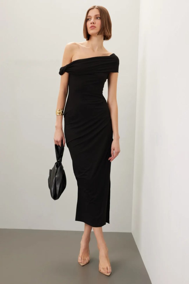 Go full quiet luxury with this mid-length black dress. Not only will it feel fresh and on-trend, thanks to the asymmetrical neckline, it’ll hug all your curves, and the minimalistic design provides the opportunity to go big with accessories. Bring on those ovesized earrings, arm cuffs, and sparkly, strappy sandals.