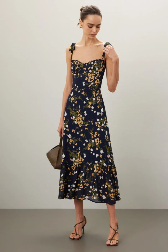 Taylor Swift isn’t the only star who has given Reformation her stamp of approval (Emma Roberts, Olivia Rodrigo, Kaia Gerber, and more are fans), but she does wear the brand often. Channel the pop princess as you watch your pals say “I do” by renting the corseted Nikita Dress. As long as you don’t act out those “Speak Now” lyrics or recreate the “I Bet You Think About Me” music video, you’re bound to have a good night in this timeless look.