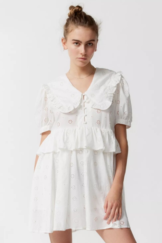 The tiered ruffles on this eyelet mini dress make it extra flirty.