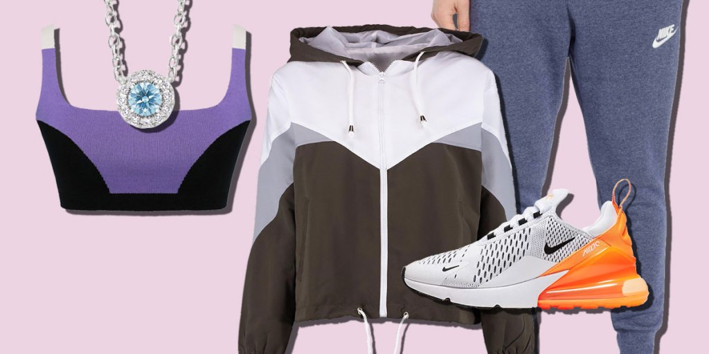 Lightbox Halo Pendant in Blue, $300 at Lightbox; Hooded Panelled Windbreaker, $18 at Boohoo Colour Block Bralet, $110 at Nagnata; Nike Heritage Jogger Pants, $55 at Nordstrom; Air Max 270, $150 at Nike.