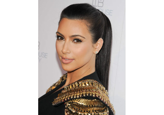 At her 30th birthday, Kim wears her hair down and sports va-va-voom lashes with black eye liner and metallic shadow lightening up the inner corners of her eyes. She keeps the rest of the makeup neutral, with nude lips and a light rosy blush.
