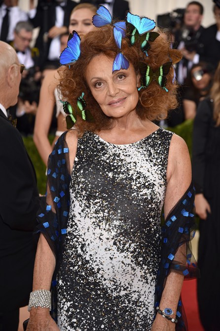 So many questions, so few answers, so much joy at seeing Diane Von Furstenberg‘s beautiful head covered in butterflies.