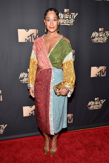 In a Jonathan Simkhai dress, Stuart Weitzman shoes, Roxanne Assoulin earrings, and an Edie Parker clutch.