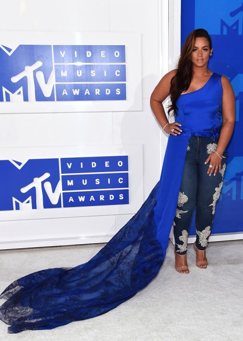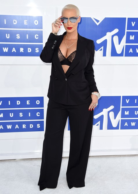 Amber Rose in a Tom Ford suit, La Perla bra, and Dior sunglasses
