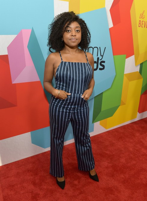 Quinta Brunson wears a navy blue striped jumpsuit.