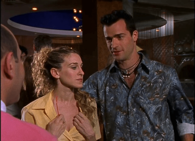Fans of SATC already know Theroux played two different characters in two different episodes—in two different seasons. His Season 1 showing as writer Jared—one of New York magazine’s “30 Coolest People Under 30″—was smarmy and totally laughable, especially when he tries to hit on Carrie at Luna Park by asking if he can take her home. Spoiler alert: He couldn’t, because she makes Mr. Big meet her outside the bar at 3 a.m.