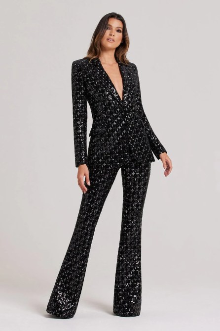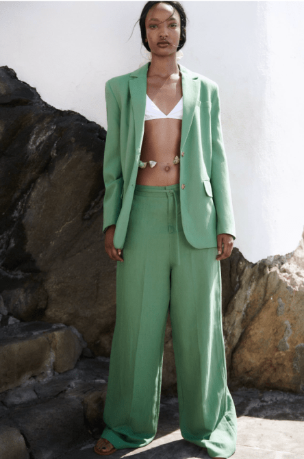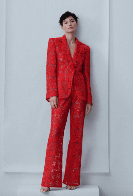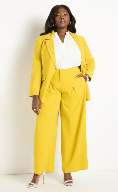 This canary yellow blazer and pant combination is sure to make a statement. This can easily be dressed up with a silk top underneath, sequin heels and a beaded bag. The best part is that you can tone the look down with a button-down (as pictured) and wear it to the office. The blazer and pants are available in sizes 14-32.