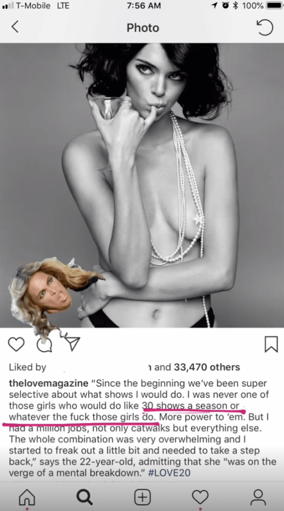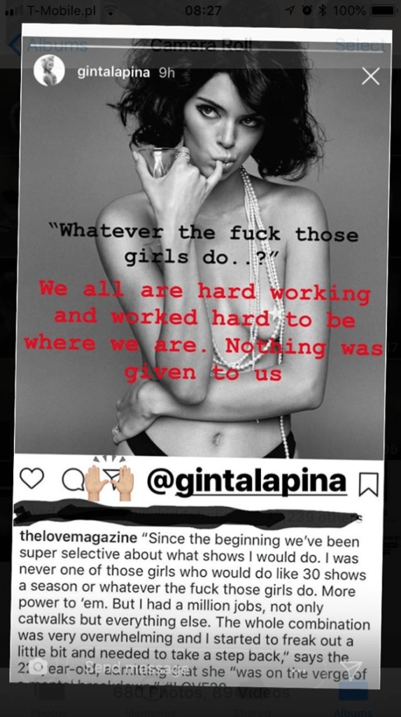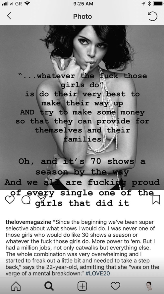 Jenner’s comment eventually made it to Love magazine’s Instagram, where it was seen by dozens of models, including Daria Strokous, Marine Deleeuw and Jac Jagaciak, W magazine first reported. In screenshots on their own Instagram stories, the models criticized Jenner for looking down on models who need to walk in 30-plus shows to make a living. Likewise, many of the models also slammed the Keeping Up with the Kardashians star not acknowledging her privilege, her celebrity family or the fact that she makes more money and has the ability turn down work whereas other models do not.