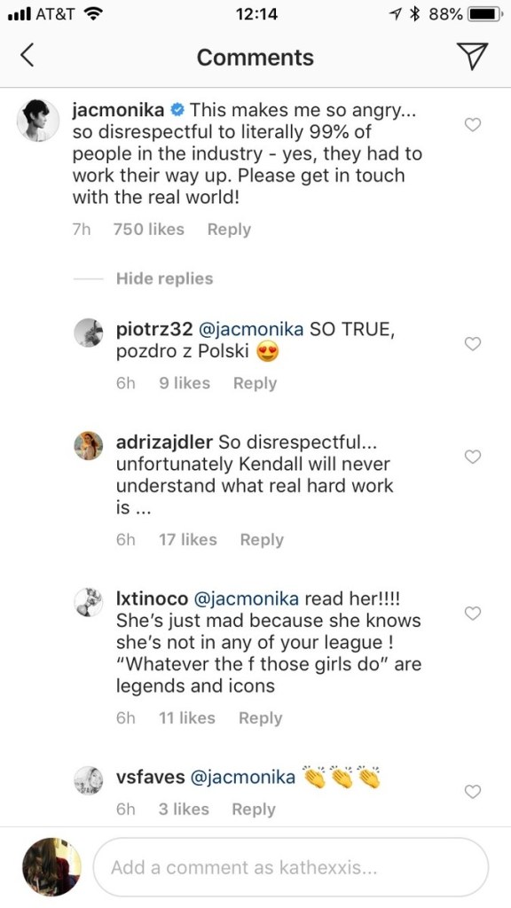 Another model added, “‘Those girls’ make expanentially [sic] less for the same job as you…Don’t come from a celebrity family…Weren’t born into privilege like you.”