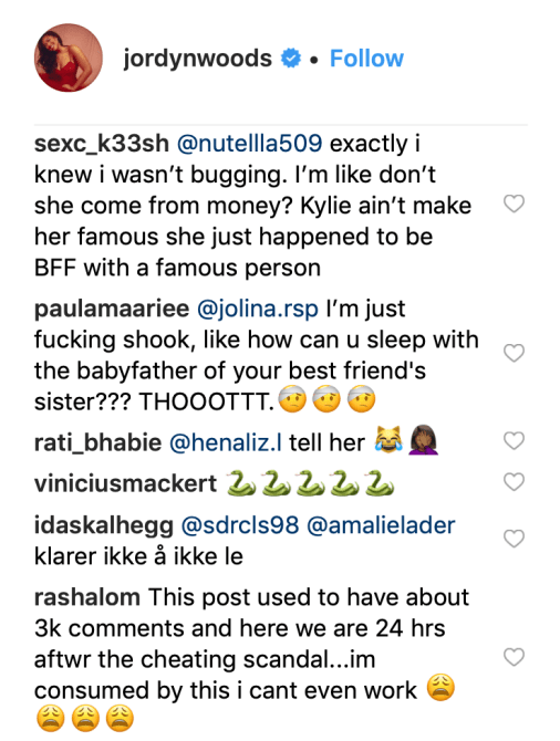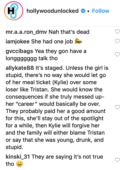 However, another Instagram user argued, once again, that the scandal must be staged, claiming it’s a way for the Kardashians to stay relevant. “It’s staged,” the user wrote. “Unless the girl is stupid, there’s no way she would let go of her meal ticket (Kylie) over some loser like Tristan. She would know the consequences if she truly messed up- her “career” would basically be over. They probably paid her a good amount for this, she’ll stay out of the spotlight for a while, then Kylie will forgive her and the family will either blame Tristan or say that she was young, drunk, and stupid.”