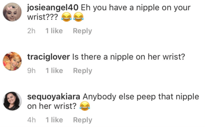 C) Lastly, I’m sorry but what is on her hand? Some people have said it looks like she has a nipple on her wrist, and we’re here to say they aren’t wrong.